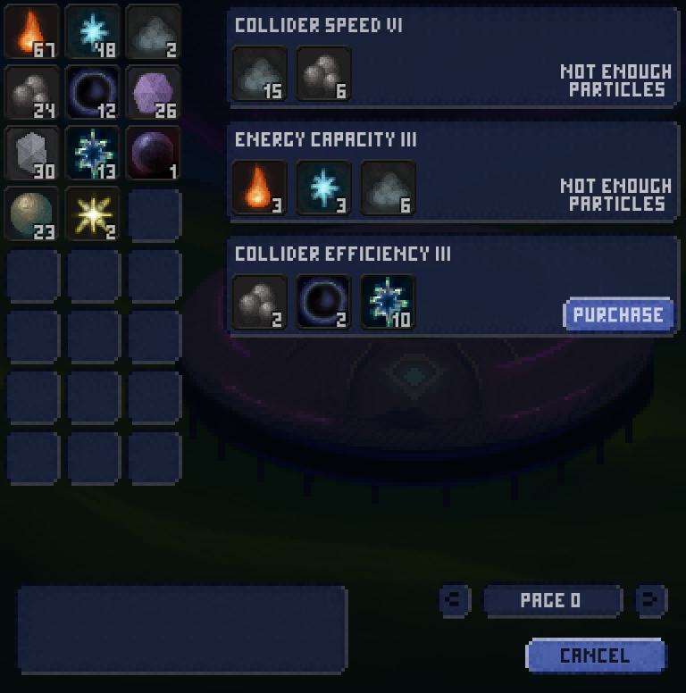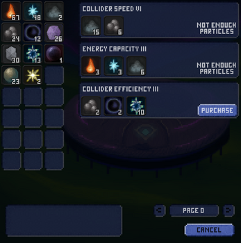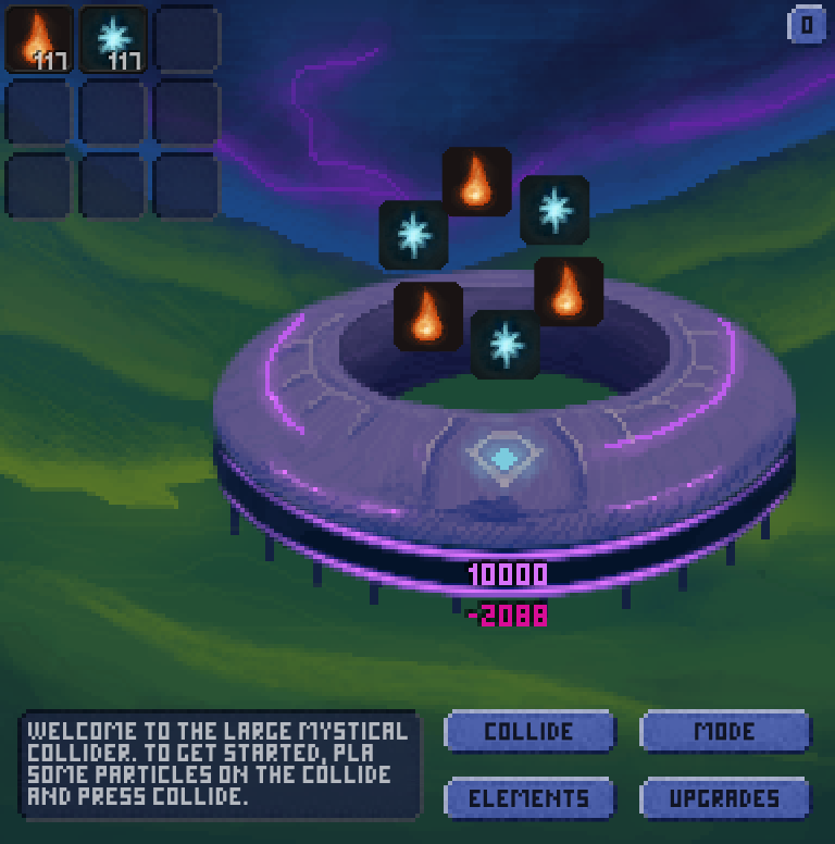 ![]() | Large Mystical Collider - Made for GMTK Game JAm 2025 Place particles in the collider and run the machine in different modes to get new and better particles. Look at the map to understand what particles will be created, based on the points of collision between the particle's vectors. |